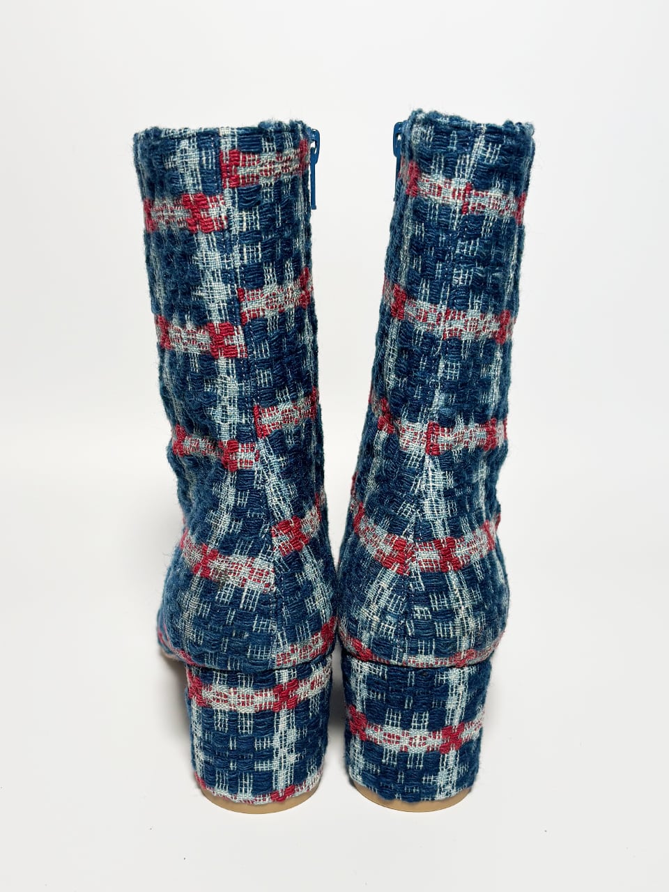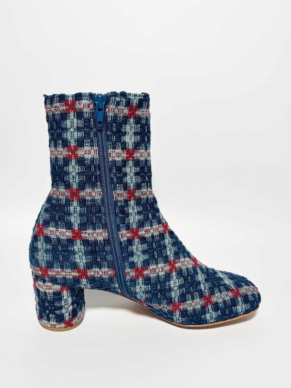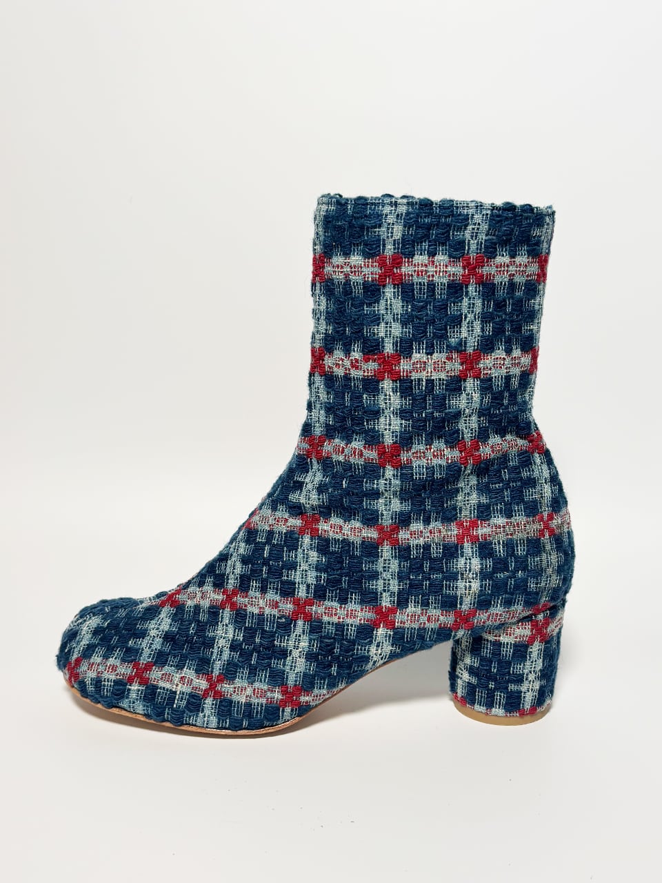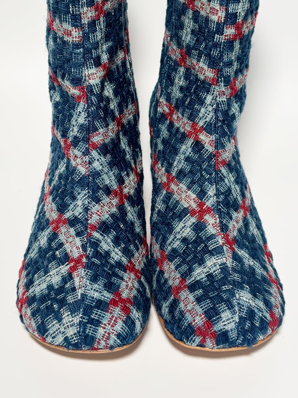 1800年代後期〜1900年代中期にOVER SHOT(オーバーショット)という技法で織られたアメリカのCOVERLET(ベッドカバー)を、贅沢に使用したショートブーツ。