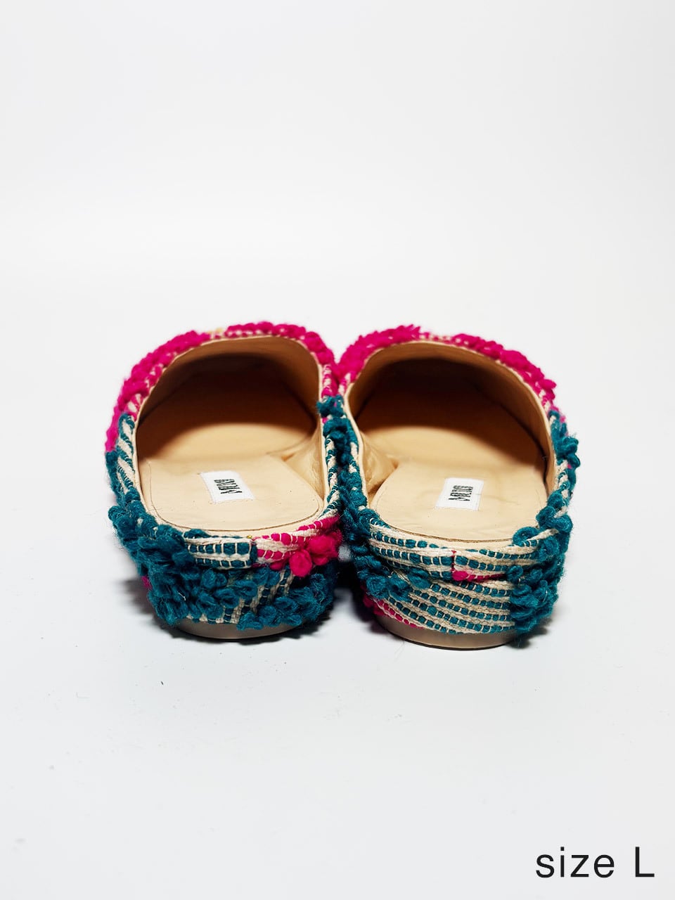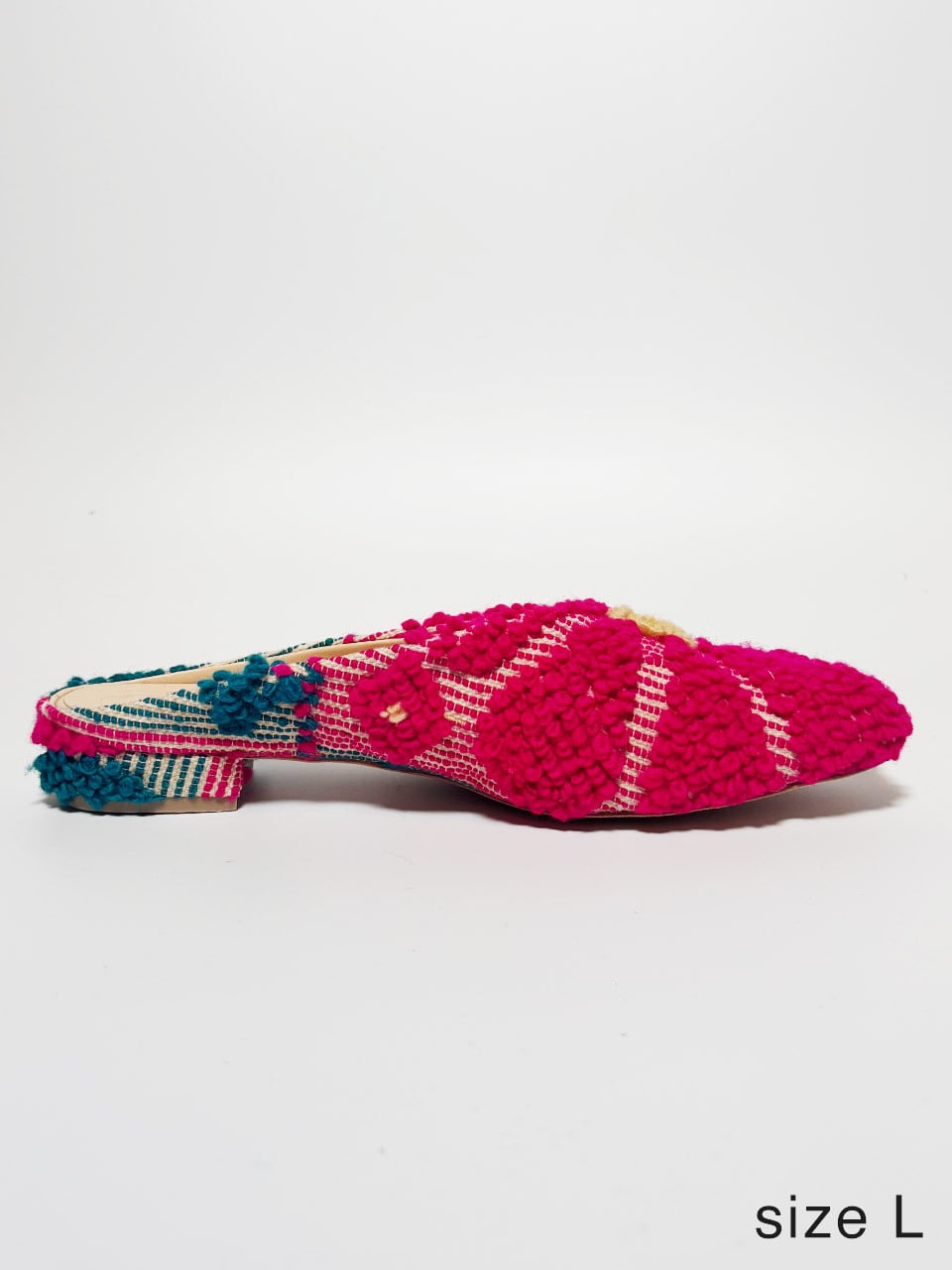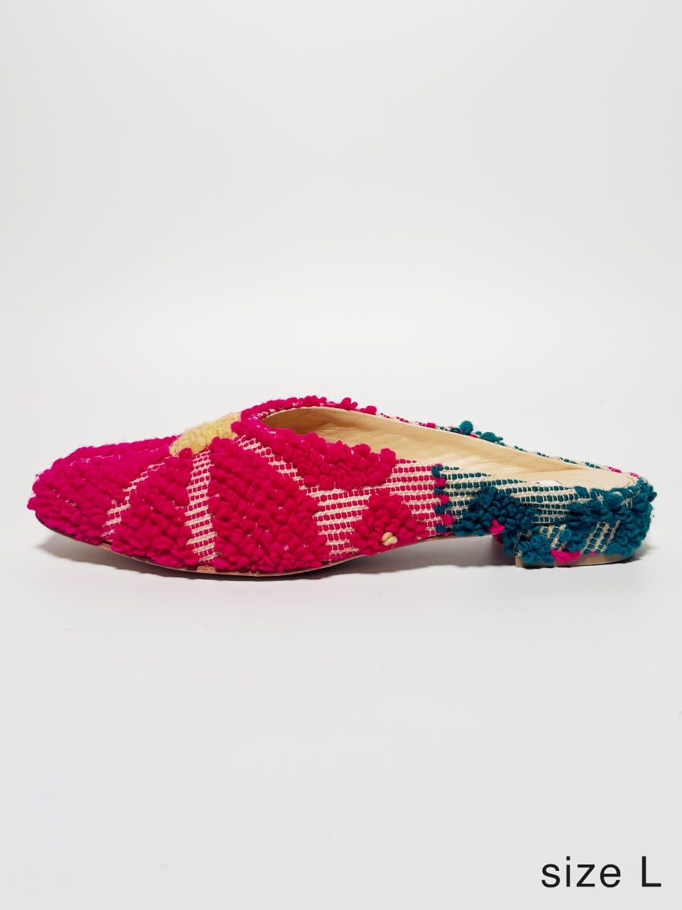 長い時を旅してきたヴィンテージファブリックを、現代的なスクエアトゥミュールへ仕立てた一足。