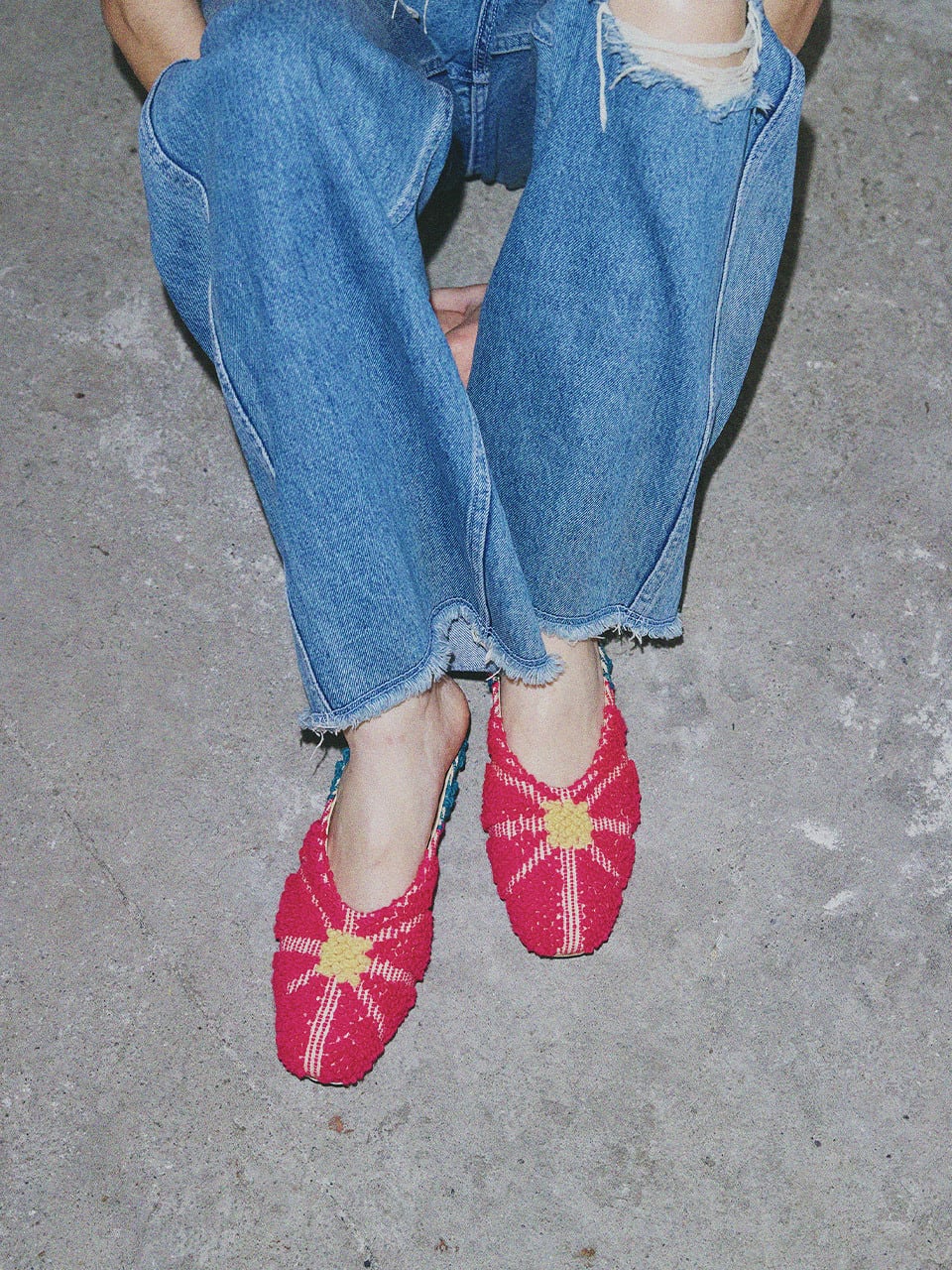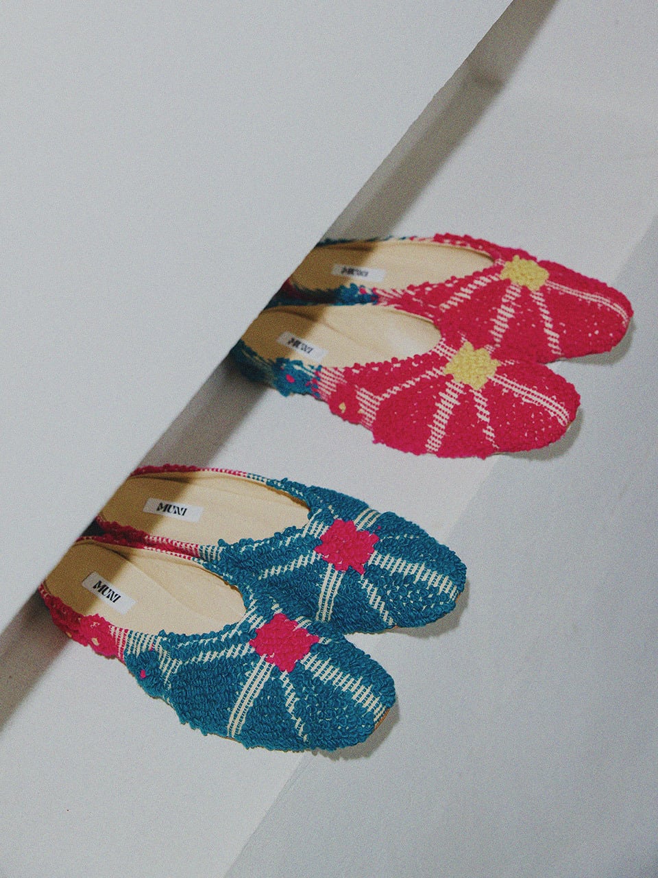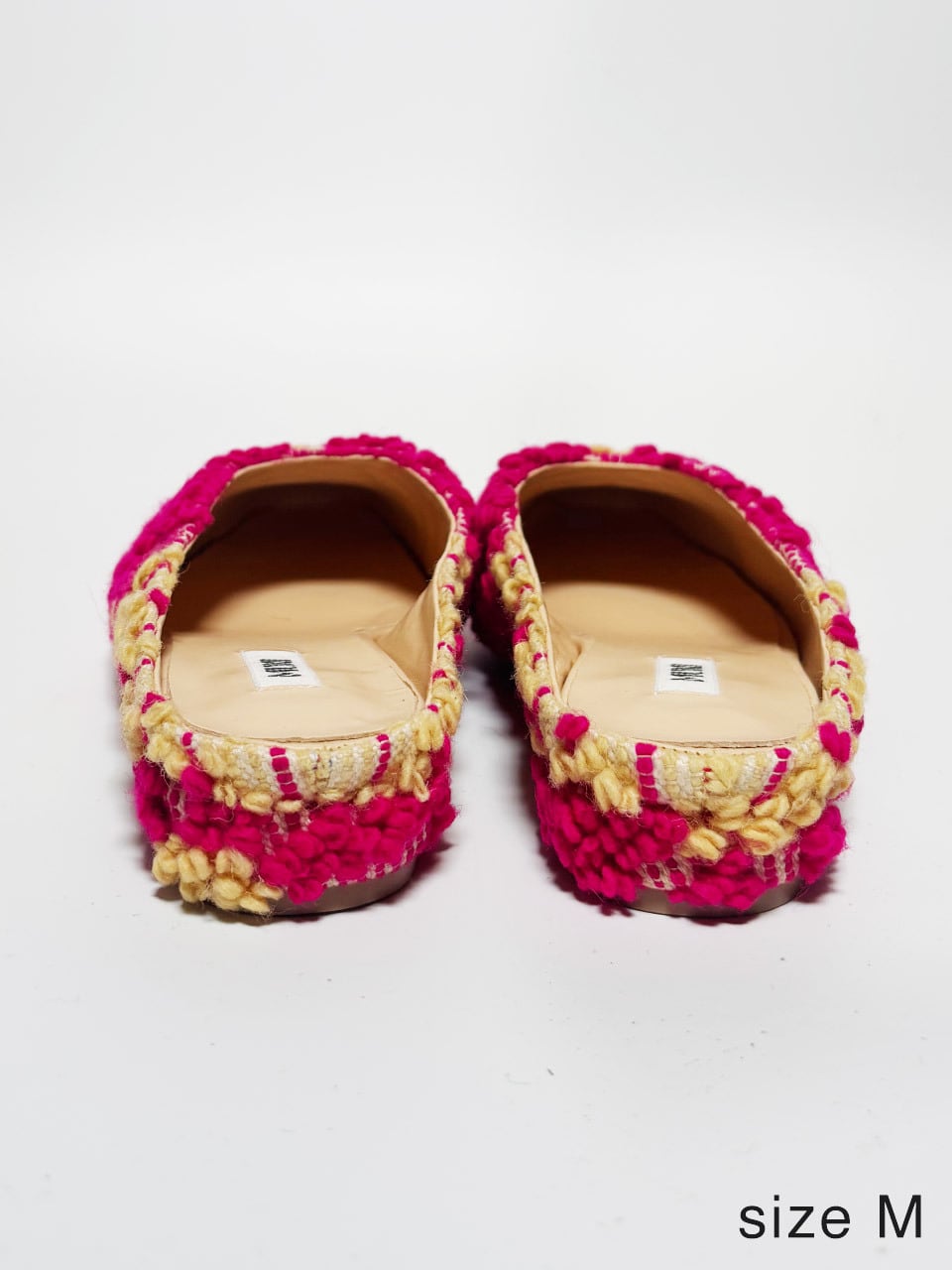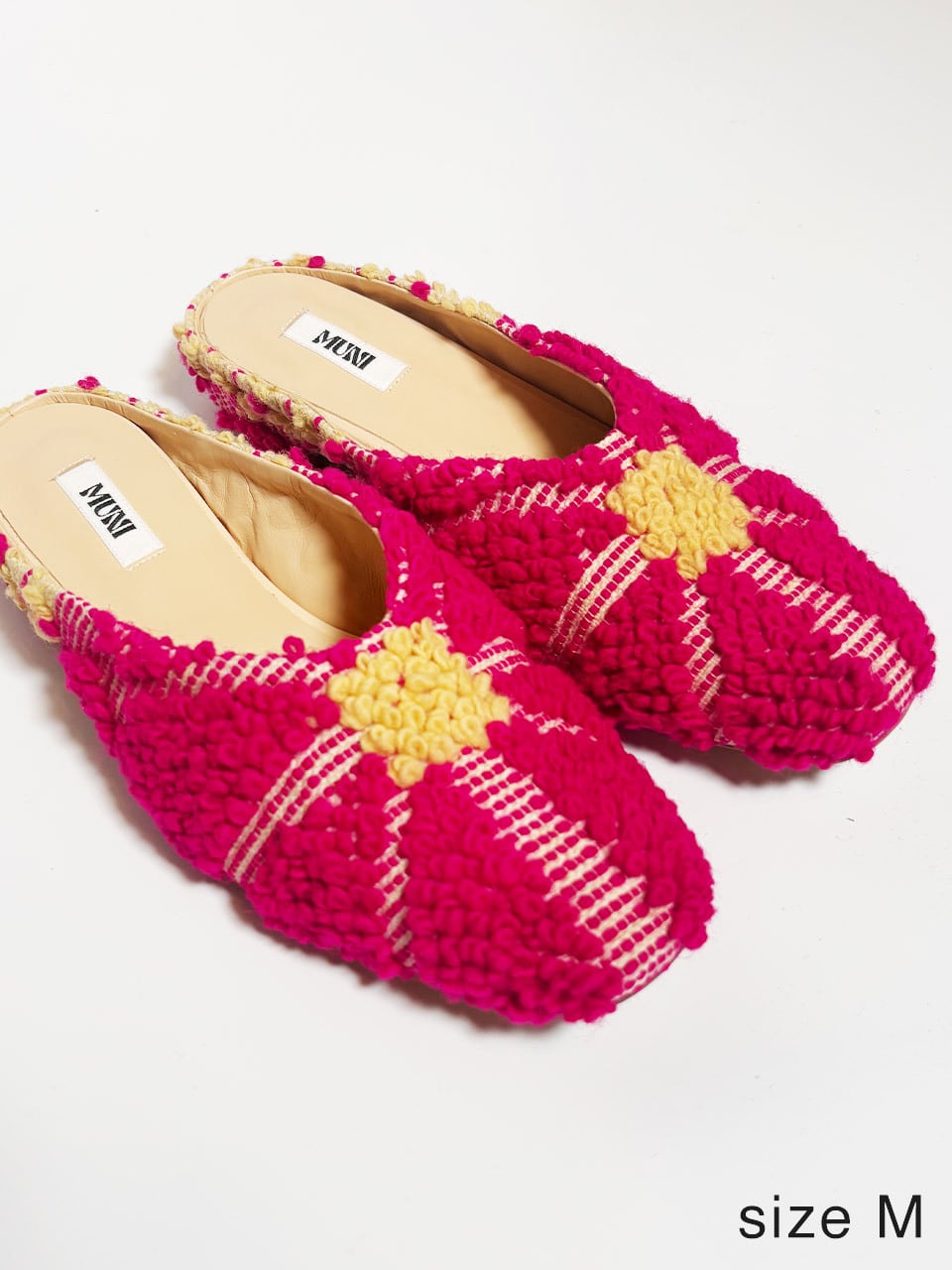 長い時を旅してきたヴィンテージファブリックを、現代的なスクエアトゥミュールへ仕立てた一足。