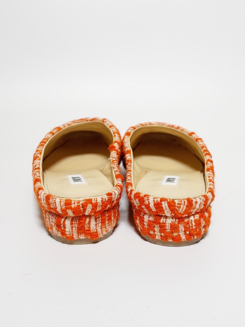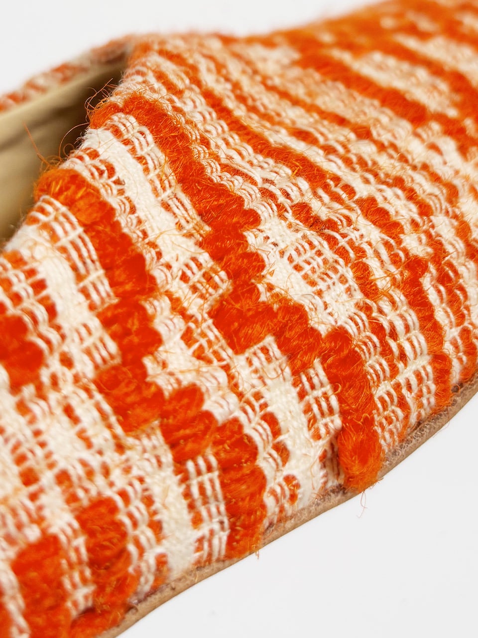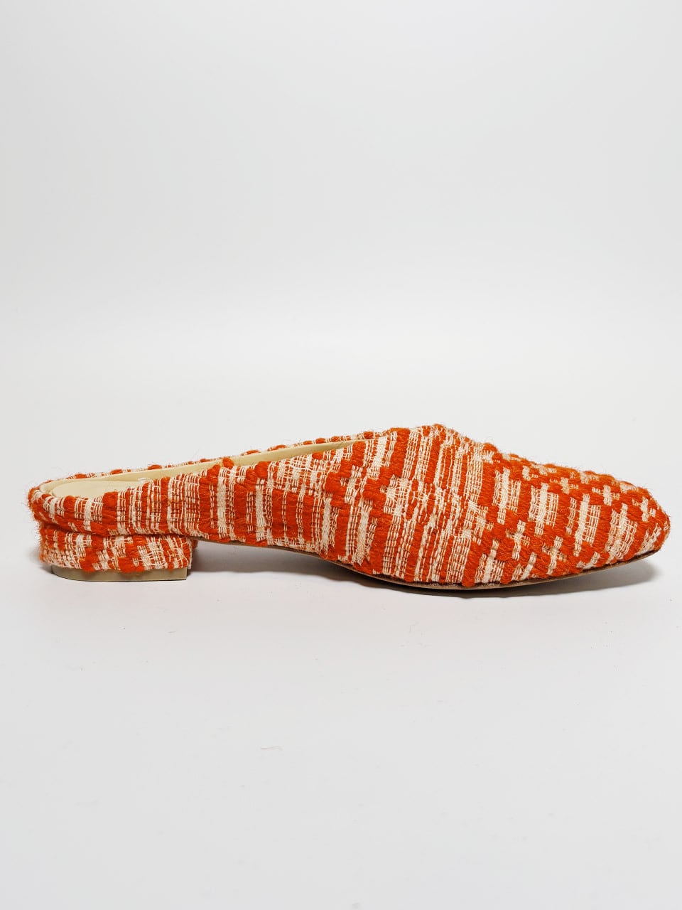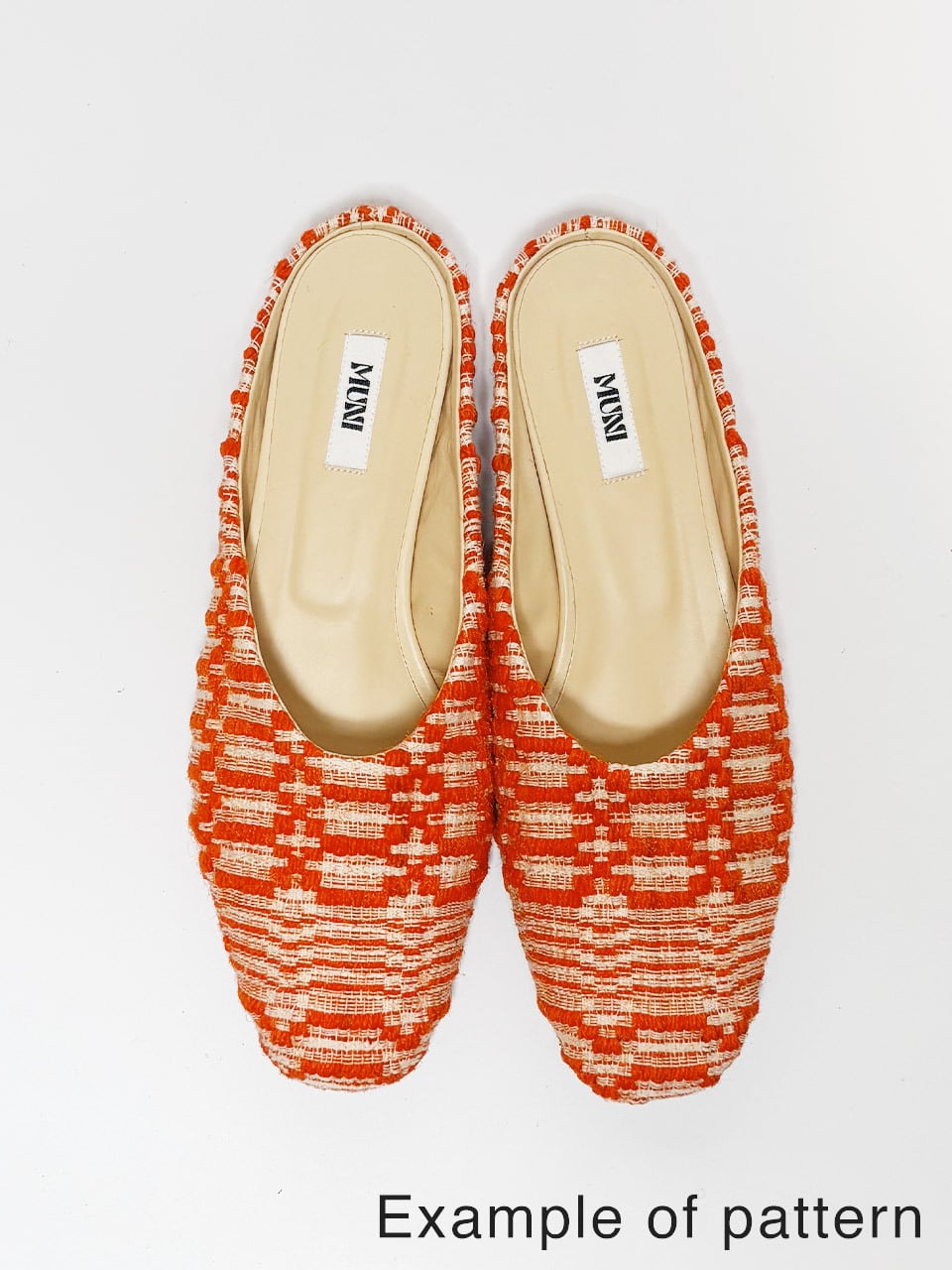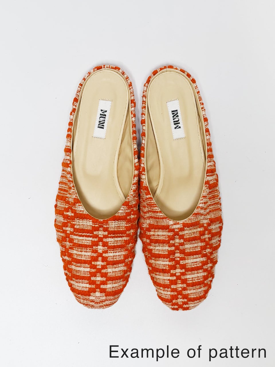 長い時を旅してきたヴィンテージファブリックを、現代的なスクエアトゥミュールへ仕立てました。