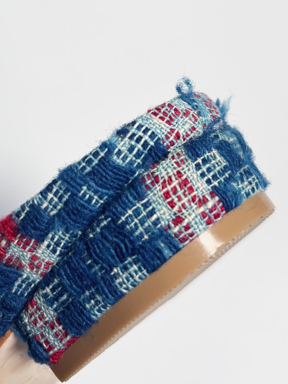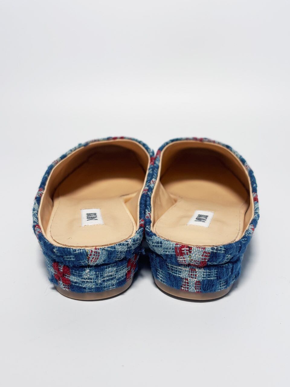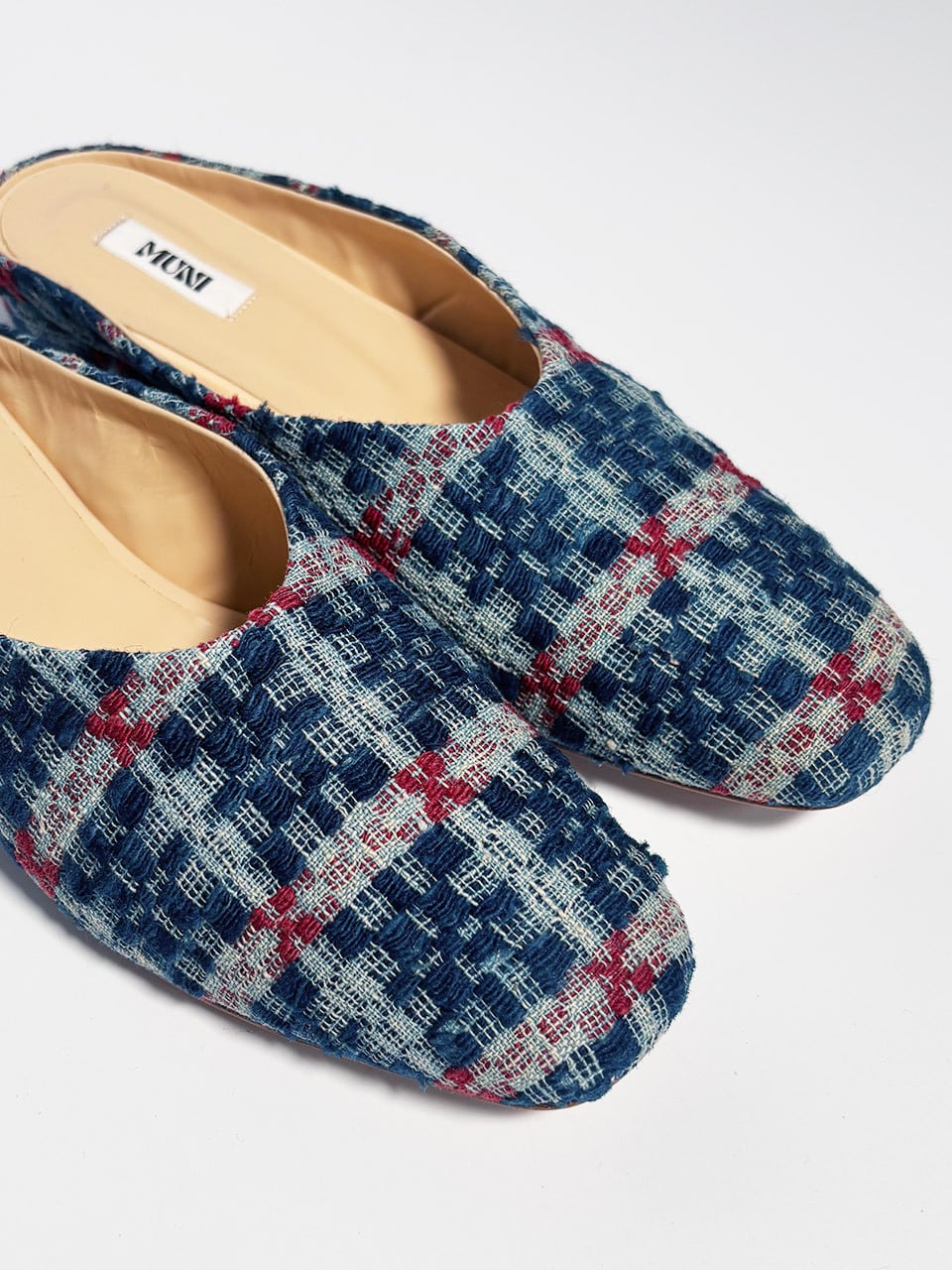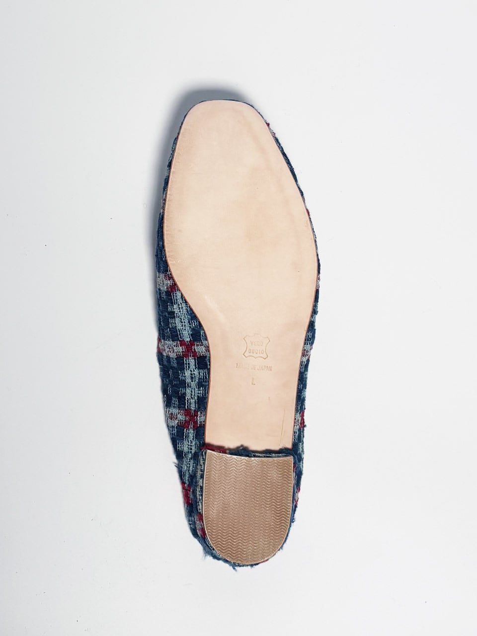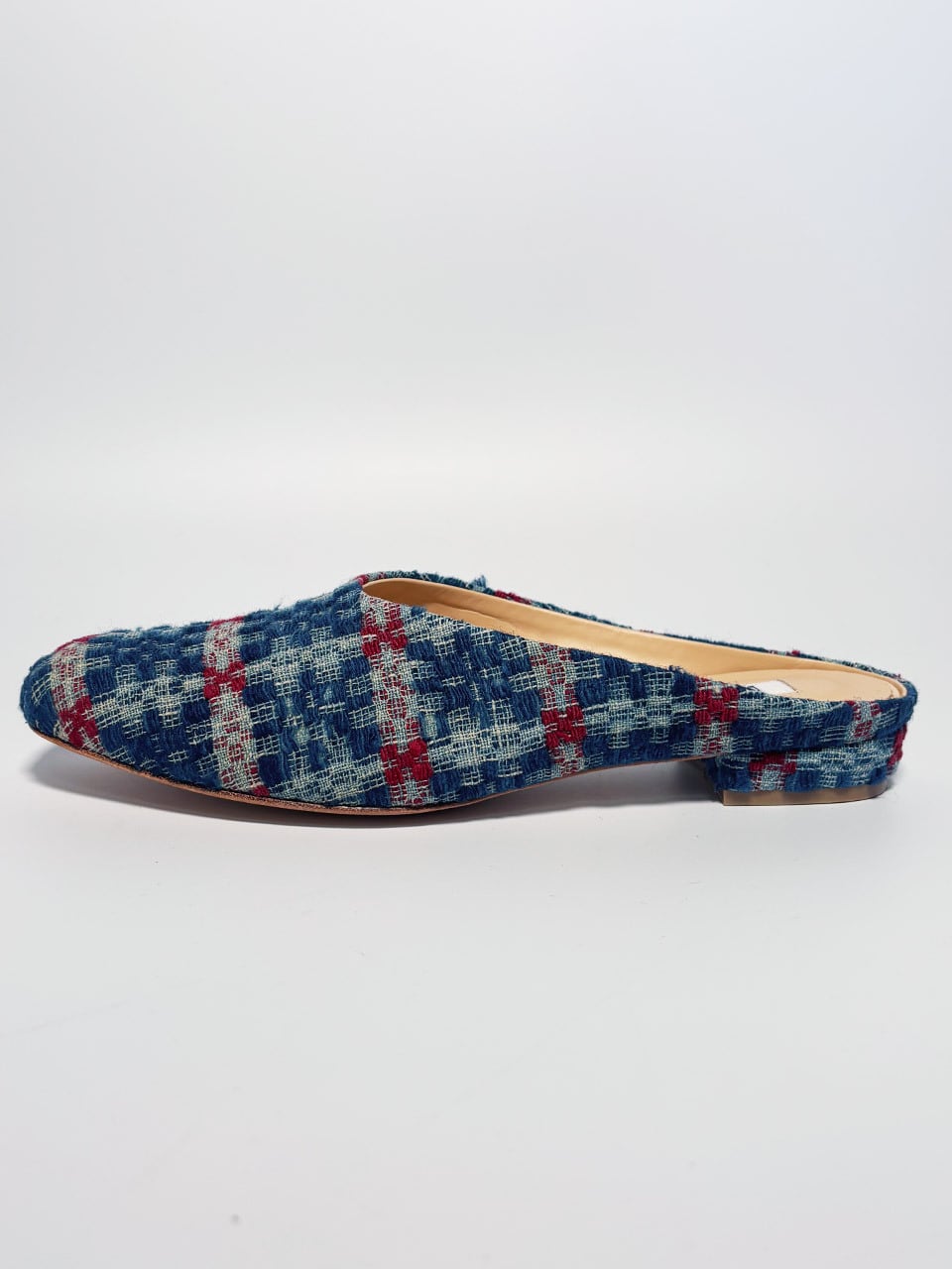 長い時を旅してきたヴィンテージファブリックを、現代的なスクエアトゥミュールへ仕立てました。