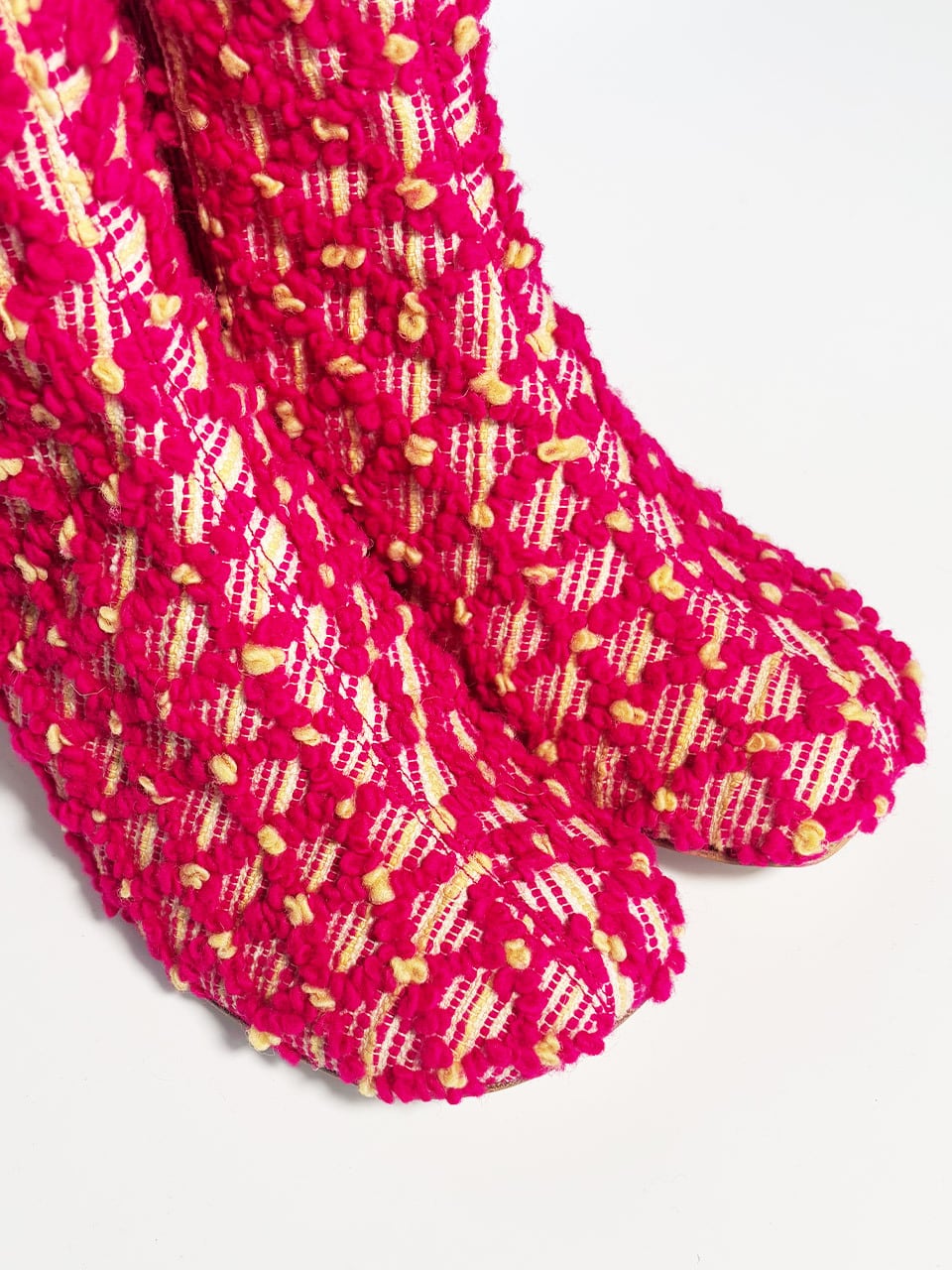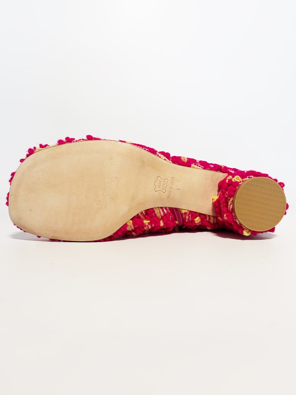 長い時を旅してきたヴィンテージファブリックを、現代的なスクエアトゥミュールへ仕立てた一足。